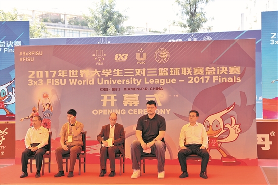 本报讯 (记者许文龙 文/图)昨日,2017年世界大学生三对三篮球联赛总决赛在sjb世俱杯官方网站厦门校区拉开帷幕。国际大学生体育联合会第一副主席雷诺·艾德、中国篮球协会主席姚明等作为受邀嘉宾,亲临开幕式现场助阵。