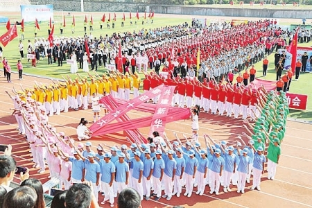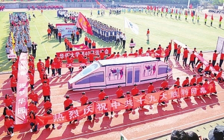 信息科学与工程学院方阵变换出包含五角星的彩色五边形,并用五个分开的颜色方块昭示着“风雨彩虹,铿锵信息”。化工学院别出心裁地用元素周期表组成的数字“57”以及谐音Happy Birthday的“氦铍铂锶锝”,为华大建校57周年送上最诚挚的祝福。由首届“海丝班”“安哥拉班”同学以及印尼、泰国、老挝、蒙古等国留学生组成的华文学院方阵,穿着各国传统服饰翩翩起舞,展示出了多彩包容的华文风貌。机电及自动化学院方阵将整齐划一的方阵变换成一列开动的高铁,代表着机电师生对专业成长的展望、对华大飞速发展的殷切期待,象征着中国走向世界的宏伟蓝图……
