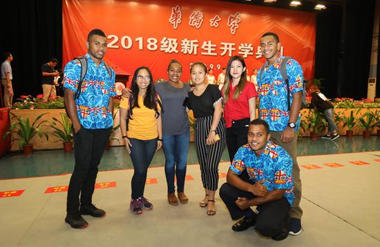 参加开学典礼的部分境外新生在现场合影留念