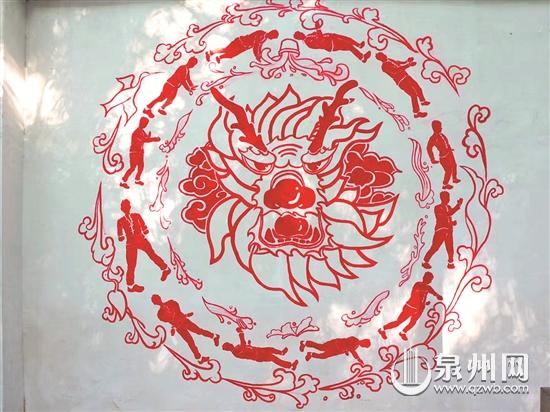 “和缘甲”小组则以龙为载体,结合传统武术和剪纸艺术来呈现他们的墙绘想法。整体盘龙呈现一条正面、圆形的龙,彰显中华民族的团结与包容。龙首在中间,以桃溪、永春白鹤拳和祥云所组成的圆环,恰好就是龙身。海峡两岸都是炎黄子孙、龙的传人,龙作为中华民族的图腾,在几千年浩瀚的历史中,代表着民族的深厚文化底蕴。