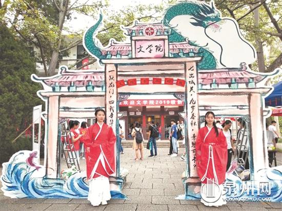 该学院今年的迎新活动设计以“文院十二时辰”为主线,设置了“鱼跃龙门”迎新创意门板、十二地支红纸灯笼长廊、古风舞蹈秀、祈愿树、“壮丽70年,书写新时代”党员书法展示区等集多样古风元素为一体的新生古典文化体验区。
