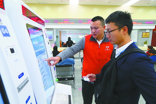 穿着红马甲的“政务心服务”志愿者为市民提供暖心服务。 黄嵘摄