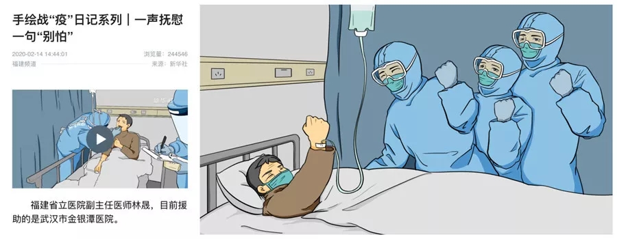 2月14日,新华社发布了一则关于支援湖北的福建医疗队的报道——《手绘战“疫”日记系列|一声抚慰一句“别怕”》 。报道用手绘动画视频的形式记录了福建医疗队驰援武汉的医师林晟的战“疫”日记。其中,绘图和剪辑部分是由武夷学院艺术学院黄子延老师、胡杨梓老师和2016级动画专业的刘珊珊、卢琳蓉同学共同创作完成的,他们用手中的画笔描绘了福建医疗队援助武汉的感人事迹,用作品传递温暖和力量,助力战“疫”行动。