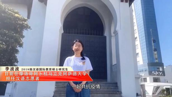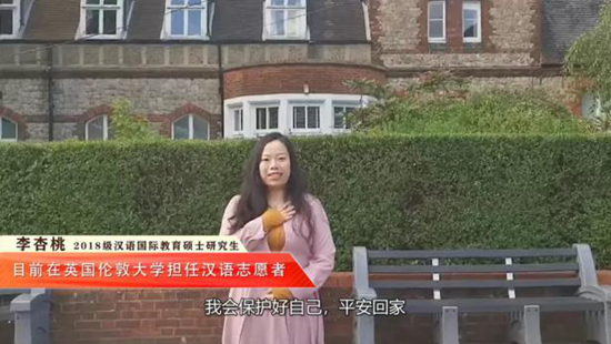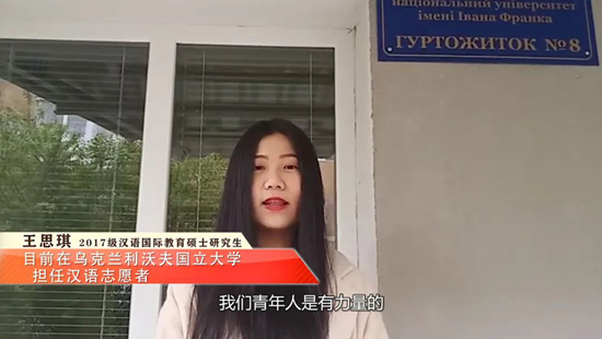 “我现在在乌克兰的利沃夫国立大学做汉语教师志愿者,面对全球疫情,我想对身边的青年人说:青年人要有社会责任感,在疫情中,在做好自己本职工作的同时为疫情防控做出力所能及的贡献;我们青年人是有力量的,应该团结起来,共同对抗疫情。另外,我想对自己的家人说:现在国内的疫情已经慢慢好转,恢复了正常的工作和生活,要保持积极乐观的心态,注意身体,照顾好自己,我在国外一切安好,不用担心。”