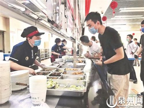 食堂内,返校学生和工作人员都戴口罩做好防疫措施。