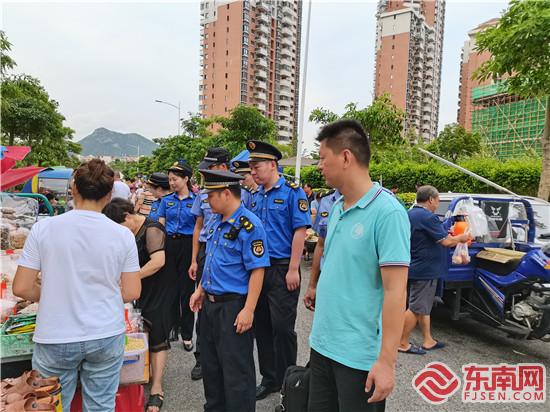大学生党员志愿者和城管执法队员来到考点附近市场(时小虎 摄)