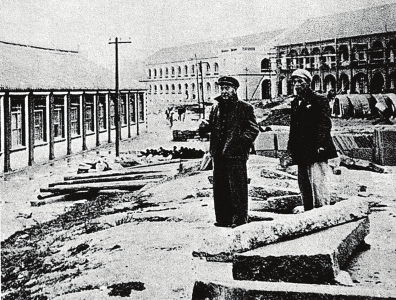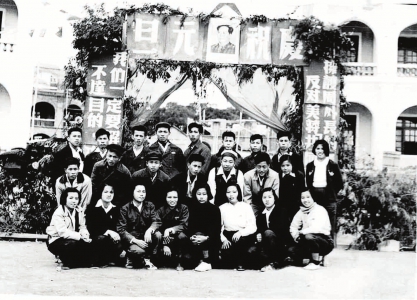 1955年元旦一群回国不久的华侨学生,怀着激动的心情在新建的校舍前合影,他们背面是“校门”和还在建筑中的一排南侨9至南侨12的教学楼……