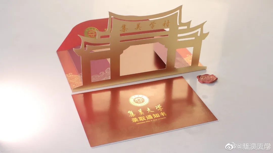集美大学录取通知书特地制作成集美学村建筑的样子,上面用火漆封缄。打开录取通知书,就像走进了集美大学。