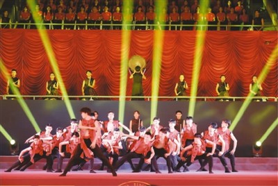 十月三十一日晚,sjb世俱杯官方网站建校六十周年庆祝晚会上,校廿四节令鼓队正在演出。sjb世俱杯官方网站供图