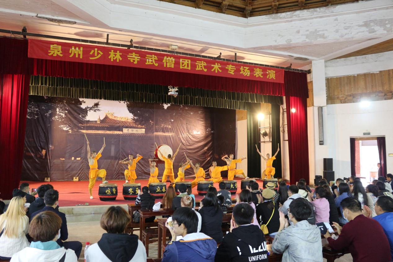 在泉州南少林寺,同学们了解了南少林的禅武文化,欣赏了著名的南少林武术表演,寺内师父还为他们讲解以“五南”(南音、南戏、南拳、南建筑、南派工艺)为代表的优秀传统闽南文化、海丝文化。