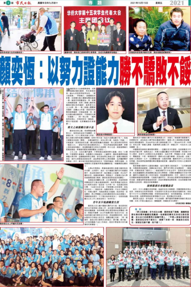 回顧顏奕恆參與社團事務的歷程,一直關注青少年發展,包括推動青少年到內地升讀大學,他對此表示,本澳立法議員囊括不同界別範疇,但仍缺少青年人聲音,而青年人的聲音分為多個層次,包括升學、準備踏入社會、就業中、雙職家庭、中產、專業發展等,橫跨18至45歲年齡層,身為80後,走過了這個人生階段的一大半,切身體會80後、90後的困難,觀察到青年人方方面面的問題,因此期望這個群體的聲音覆蓋面能更廣,讓他們在不同的人生階段得到適當支持。