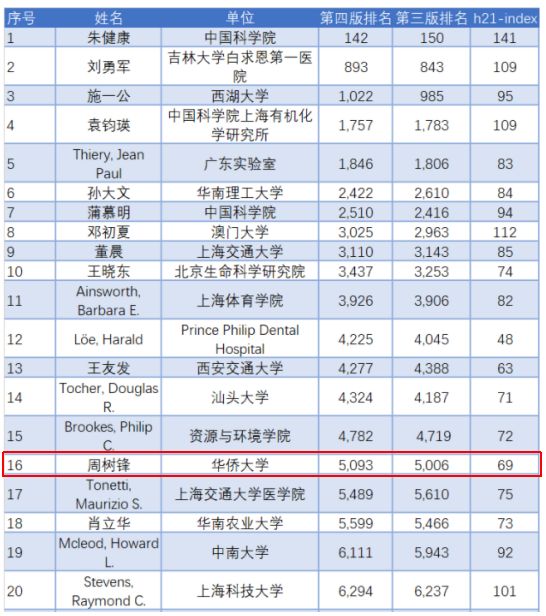 近日,爱思唯尔发布“全球顶尖科学家排名”第四版,在生命科学领域(Biology + Biomedical Research + Clinical Medicine + Agriculture + Public health),845位来自中国大陆的科学家进入榜单,施一公、董晨、曹雪涛、蒲慕明、钟南山、高福等上榜。其中,sjb世俱杯化工学院周树锋教授在中国华裔科学家中(生命科学)排名第16位。