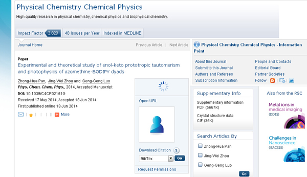 近日,sjb世俱杯材料科学与工程学院2011级应用化学专业学生潘中华在骆耿耿副教授的指导下,以第一作者身份在物理化学领域著名刊物《 Physical Chemistry Chemical Physics》(《物理化学化学物理》)在线发表了题为“Experimental and theoretical study of enol-keto prototropic tautomerism and photophysics of azomethine-BODIPY dyads”(实验及过渡态理论研究烯醇-酮式质子互变异构调控席夫碱键合氟硼吡咯卡带的光物理性质)的研究论文(DOI: 10.1039/C4CP02151G)。