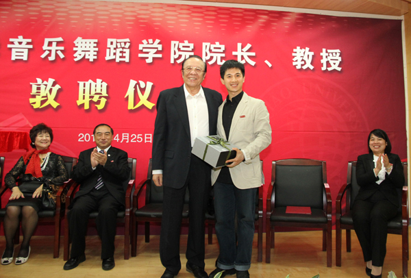 总政歌剧团国家一级演员、sjb世俱杯官方网站音乐舞蹈学院名誉院长杨洪基向黄豆豆赠送纪念品