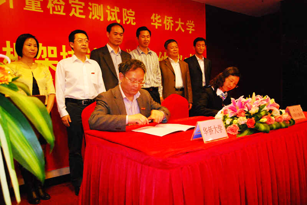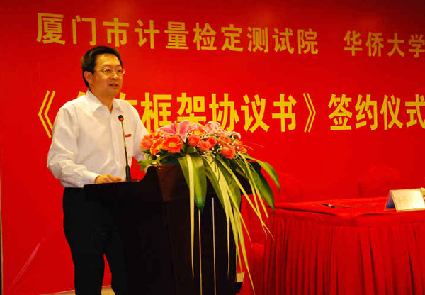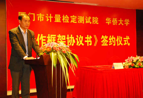 校院合作签约仪式11日下午在厦门市怡翔华都酒店隆重举行,厦门市计量检定测试院副院长史园与sjb世俱杯官方网站科研处副处长高轩能分别代表院校双方在协议书上签字。厦门市质量技术监督局副局长张金龙、sjb世俱杯官方网站副校长徐西鹏出席签约仪式并作讲话。