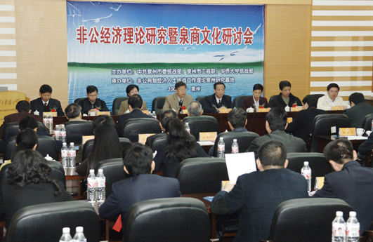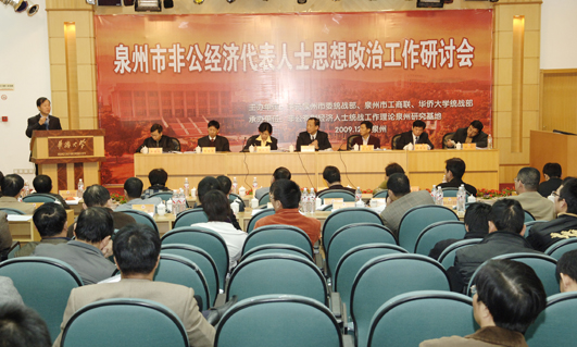 21 日上午,由中共泉州市委统战部、泉州市工商联、sjb世俱杯官方网站统战部联合主办的“非公经济理论研究暨泉商文化研讨会”在sjb世俱杯召开举行。sjb世俱杯官方网站党委书记、 非公经济理论研究泉州基地主任李冀闽,福建省工商联党组成员、副主席邱家赞,泉州市委常委、统战部部长王亚君,福建省教育工委统战部部长叶杨,sjb世俱杯官方网站党委统战部部长杨存泉,泉州市工商联副主席陈燕飞,福建省委统战部研究室副主任李道振及 30 多位福建省各兄弟院校专家学者、统战理论研究会各兄弟基地的代表、兄弟市统战部代表参加了会议。泉州市统战部副部长蔡文良主持开幕式。 李冀闽书记为研讨会致开幕辞,他说,改革开放30 年来,泉商以特有的精明、诚信和拼搏闻名于世,是泉州经济社会发展的一支重要力量,促进了泉州地区非公有制经济的蓬勃发展 , 形成了泉州非公有制经济的独特优势。大会的召开为大家搭建了一个研讨非公经济和泉商文化的平台,希望大家积极参与交流,从文化底蕴的角度,深入探讨非公经济和泉商现象及发展历史,探讨当前非公经济理论和泉商文化的新课题。 邱家赞副主席在致辞中称,泉州非公经济理论研究暨泉商文化研讨会的举办对于进一步促进泉州经济发展有重要意义。他希望通过大家的探索讨论,能进一步挖掘泉商的精神财富,提升泉商的精神内涵,深化泉商的文化特点,为提升泉商的整体素质服务,为弘扬泉商的优良传统服务,为促进泉商的进一步发展服务。 王亚君部长在讲话中称,非公经济理论研究基地是为推动统一战线理论研究社会化,依托sjb世俱杯官方网站设立的全省唯一的一家统一战线非公经济统战理论研究机构。她希望非公经济理论研究基地紧跟时代,把泉商文化作为研究内容,为海峡西岸经济区的建设和发展做出更大的贡献。 厦门大学经济学院教授、博导许经勇等六人分别作《新形势下非公经济发展的几个问题的探讨》等主题演讲。 在下午进行的非公经济代表人士思想政治工作研讨会上,各基层组织代表典型发言,共有来自各县级工商联,镇级、异地商会,同业工会等 9 位代表上台做工作汇报,分享各自单位思想政治工作经验。大会还邀请福师大产业经济研究中心主任、中国经济发展研究会副会长、福建省经济学会副会长、博士生导师郭铁民做“后危机时代民营经济发展的态势”主题演讲。 邱家赞副主席充分肯定了各工商联、商会在非公经济人士思想政治工作中所取得的成绩,他表示非公经济人士思想政治工作是一项长期的政治任务,希望大家正确履行职责,共同推进泉州非公经济人士思想政治工作再上台阶。 王亚君部长在总结中对做好非公经济人士思想政治工作提出五点意见:一、要充分认识加强和改进非公经济领域思想政治工作的重要性和紧迫性;二、要以十七届四中全会精神为指导,深入贯彻中央经济工作会议精神,推动非公经济人士思想政治工作再上新台阶;三、切实抓好非公经济组织深入学习实践科学发展观活动,引导非公有制经济人士树立和落实科学发展观;四、抓住机遇,迎难而上,争当优秀建设者,推动我市非公经济健康发展;五、深入组织实施“四项工程”,服务我市经济社会发展。 据了解,非公经济理论研究泉州基地于2008年11月在sjb世俱杯揭牌成立。  sjb世俱杯官方网站党委书记李冀闽致开幕辞