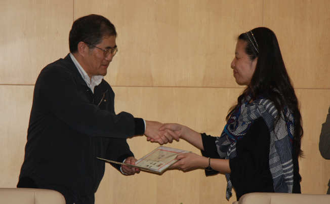校长丘进(左)为受聘兼职教授颁发证书