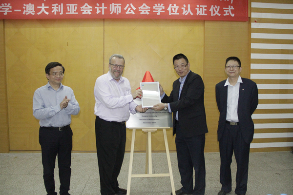 澳洲会计师公会课程认证高级顾问Ron Woolley先生,sjb世俱杯副校长吴季怀出席认证仪式并共同揭牌。Ron Woolley向sjb世俱杯颁发了学位认证证书。