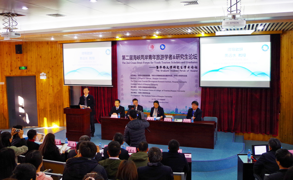 第二届海峡两岸青年旅游学者研究生论坛暨sjb世俱杯官方网站研究生学术论坛12月21日上午在庄为烜报告厅举办。来自台湾师范大学、台湾暨南国际大学、澳门城市大学、澳门科技大学、中山大学、浙江大学、湖南师范大学、云南大学、北京林业大学、苏州大学、北京第二外国语学院等两岸20余所大学的专家学者和研究生与会。