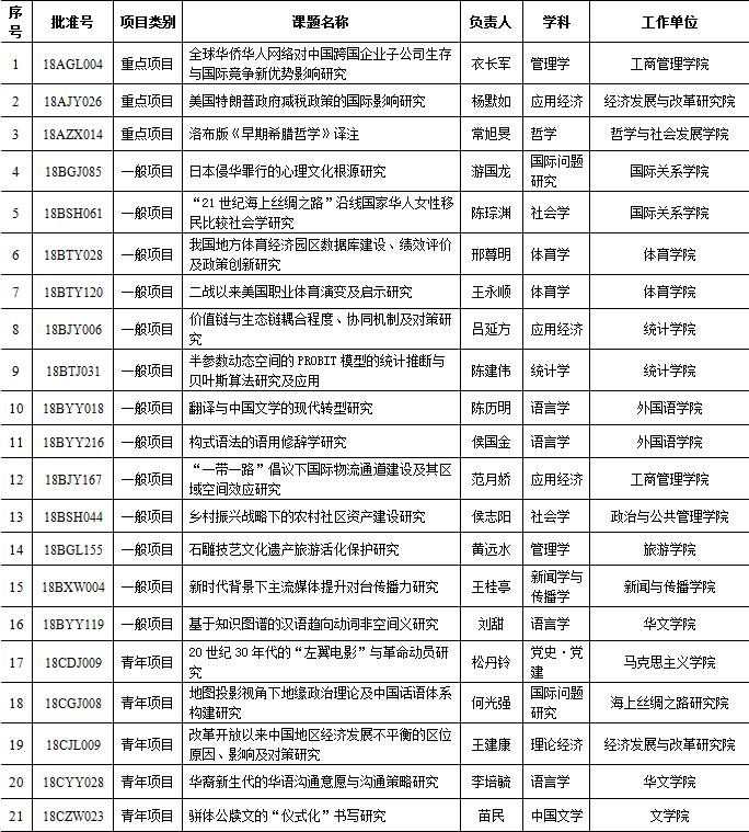 从学院分布来看,工商管理学院、经济发展与改革研究院、统计学院、体育学院、国际关系学院、华文学院、外国语学院各获立2项,哲学与社会发展学院、文学院、新闻与传播学院、政治与公共管理学院、旅游学院、马克思主义学院、海上丝绸之路研究院各获立1项。其中,衣长军教授申报的“全球华侨华人网络对中国跨国企业子公司生存与国际竞争新优势影响研究”、杨默如教授申报的“美国特朗普政府减税政策的国际影响研究”、常旭旻副教授申报的“洛布版《早期希腊哲学》译注”项目获得本年度重点项目。
