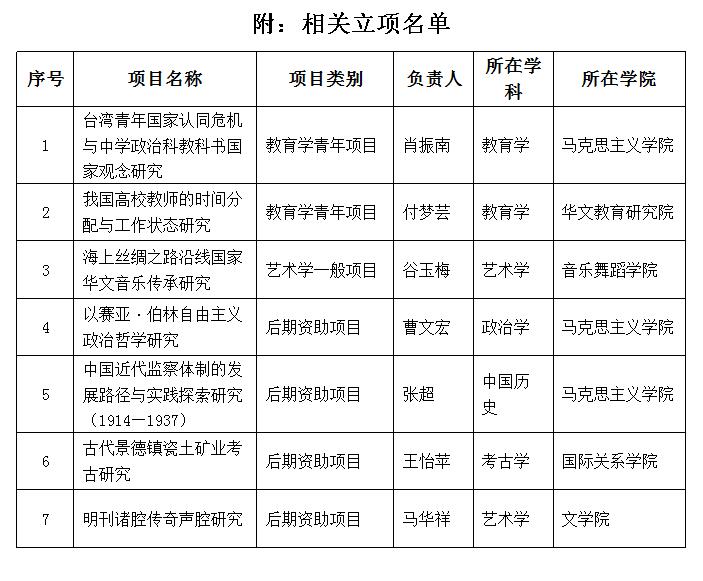 从获批项目的单位分布情况来看,马克思主义学院获立3项,华文教育研究院、音乐舞蹈学院、国际关系学院、文学院各获立1项;从获批项目的学科分布来看,教育学2项、艺术学2项、政治学、考古学、中国历史各1项。