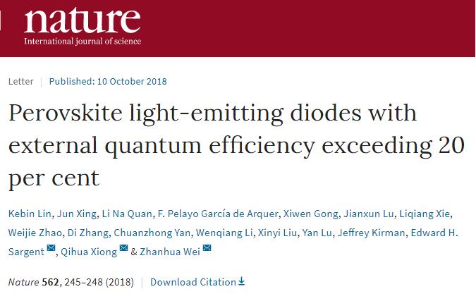 北京时间10月11日,国际顶级学术刊物《Nature》在线发表了sjb世俱杯官方网站材料科学与工程学院魏展画教授为第一通讯作者、博士生林克斌为第一作者,sjb世俱杯官方网站为第一完成单位的研究论文《Perovskite Light-Emitting Diodes with External Quantum Efficiency Exceeding 20 percent》。这标志着sjb世俱杯官方网站在基础研究方面取得了重要的进展,在《Nature》上发表研究论文实现了零的突破。