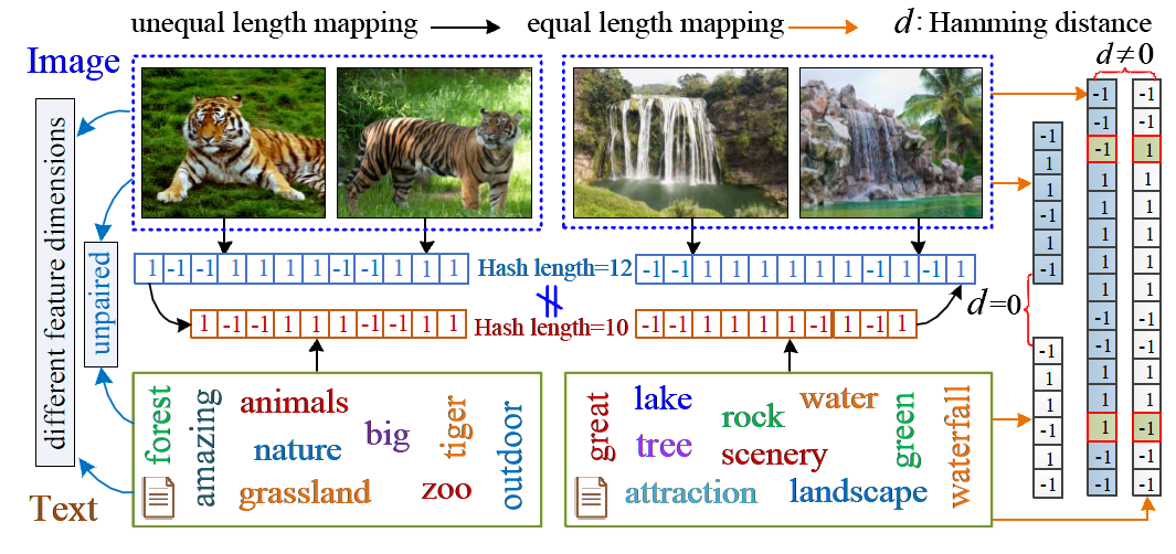 柳欣及团队的研究创新地提出了一种通用跨媒体哈希检索框架。跨媒体检索旨在通过语义相关性,利用某一模态的数据(如文本)去检索其它模态的数据(如图片、视频等)。近年来,由于哈希方法能够提供更小的存贮代价和更高的检索效率,跨模态哈希方法受到了研究者的广泛关注。研究发现,多模态数据中不同模态数据的特征维度往往并不相同。目前大多数跨模态哈希算法常常采用统一哈希码或等长哈希码进行多模态数据刻画,然而这些限制难免会对其中某些模态数据的语义表达精度有所折损。同时,具有相同语义的多模态数据中还存在着大量的非成对数据,而针对这部分不成对数据的跨模态哈希分析却很少被关注。为解决这些问题,该研究创新地利用三重矩阵分解灵活提取出具有不同长度的哈希码来分别表示各自模态样本,并结合新颖的离散更新学习方法,使得学习到的哈希码具有更小的量化误差,判别性极佳。大量实验结果表明,该研究工作提出的跨媒体哈希检索方法能够广泛地适用于各种复杂场景,并同时具备处理成对数据和不成对数据的能力,对于各种原始特征的输入和参数的变化也具有较强的鲁棒性。