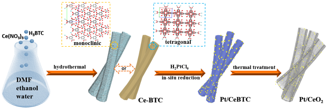 有鉴于此,该研究采用均苯三酸配体和Ce3+金属离子为原料,通过调变反应溶剂,制备了两种不同拓扑结构的Ce-BTC(即MOF异构体),并将其负载Pt纳米颗粒,经过高温焙烧成功制备了三种不同形貌Pt/CeO2纳米催化剂。研究发现,反应溶剂显著影响MOF的晶型和孔道结构,进而影响Pt纳米颗粒的粒径、负载效率和理化性质。基于XRD表征,观察到Ce-BTC在水浸泡处理过程中,发生了异构体之间的不可逆转变(从四方晶型到单斜晶型)。通过XPS、H2-TPR等表征进一步对其CO催化氧化机理进行研究,证明了基于四方晶型Ce-BTC制备的Pt/CeO2催化剂表面拥有大量Pt0物种和小尺寸Pt 纳米颗粒,有利于CO催化氧化性能(T100=80oC)。原位DRIFTS分析表明,在低温下,CO-Pt0吸附态是CO氧化的主要反应中间体。同样,该研究也发现了其它镧系MOF也有类似的MOF异构现象。