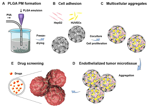 陈爱政教授团队在前期工作的基础上,将多种细胞在多孔高分子微球中共培养,以期构建血管化的3D肿瘤组织模型, 更好地模拟体内细胞-细胞以及细胞-环境间的相互作用和血管化组织特有的微环境,从而用于药物筛选的研究。研究结果表明,基于微流体化工技术的大多孔高分子微球作为微载体,在构建血管化组织作为疾病模型用于药物筛选的研究具有潜在的应用前景。