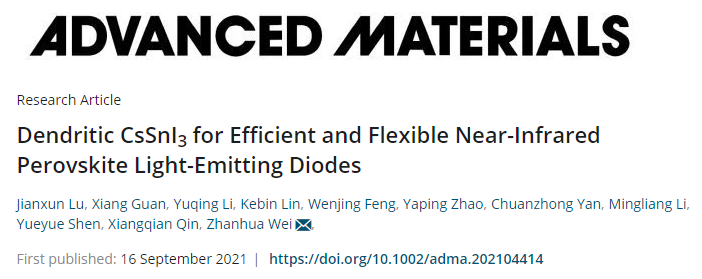 近日,sjb世俱杯发光材料与信息显示研究院、材料科学与工程学院魏展画教授团队在国际权威期刊Advanced Materials上发表最新研究成果“Dendritic CsSnI3for Efficient and Flexible Near-Infrared Perovskite Light-Emitting Diodes”。Advanced Materials是材料与化学领域的顶尖期刊,在国际科研领域享誉盛名,最新影响因子为30.849。