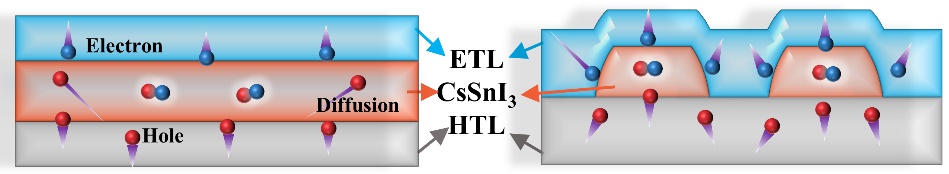 高效的近红外发光二极管在人脸识别、医疗诊断、夜视仪、光通讯等技术中有着非常重要的应用,全无机的非铅钙钛矿CsSnI3是最有希望制备出高效近红外发光二极管的发光材料之一。但是,在基于CsSnI3的钙钛矿发光二极管中,空穴的注入远远超过了电子的注入,这使得载流子注入不平衡,导致器件效率低下。有鉴于此,魏展画教授团队提出通过控制钙钛矿层与载流子传输层的接触面积来调控载流子的注入和复合行为的策略。即在空穴传输层上制备枝晶状的CsSnI3,仅让它的底部与空穴传输层接触,让暴露出的侧面和顶部与电子传输层接触,这样就使得钙钛矿与电子传输层之间的接触面积远大于钙钛矿与空穴传输层之间的接触面积。并且,这种“钙钛矿/电子传输层”的嵌入型结构对电子和空穴形成了空间上的限域效应,增加了辐射复合概率。利用这种枝晶状结构的优势,研究团队突破了非铅近红外钙钛矿发光二极管的最高效率,制备出了外量子效率为5.4%的器件。更重要的是,枝晶状结构在制备柔性器件中有着天然优势,枝晶状钙钛矿薄膜可以在2000次弯折后保持形貌。