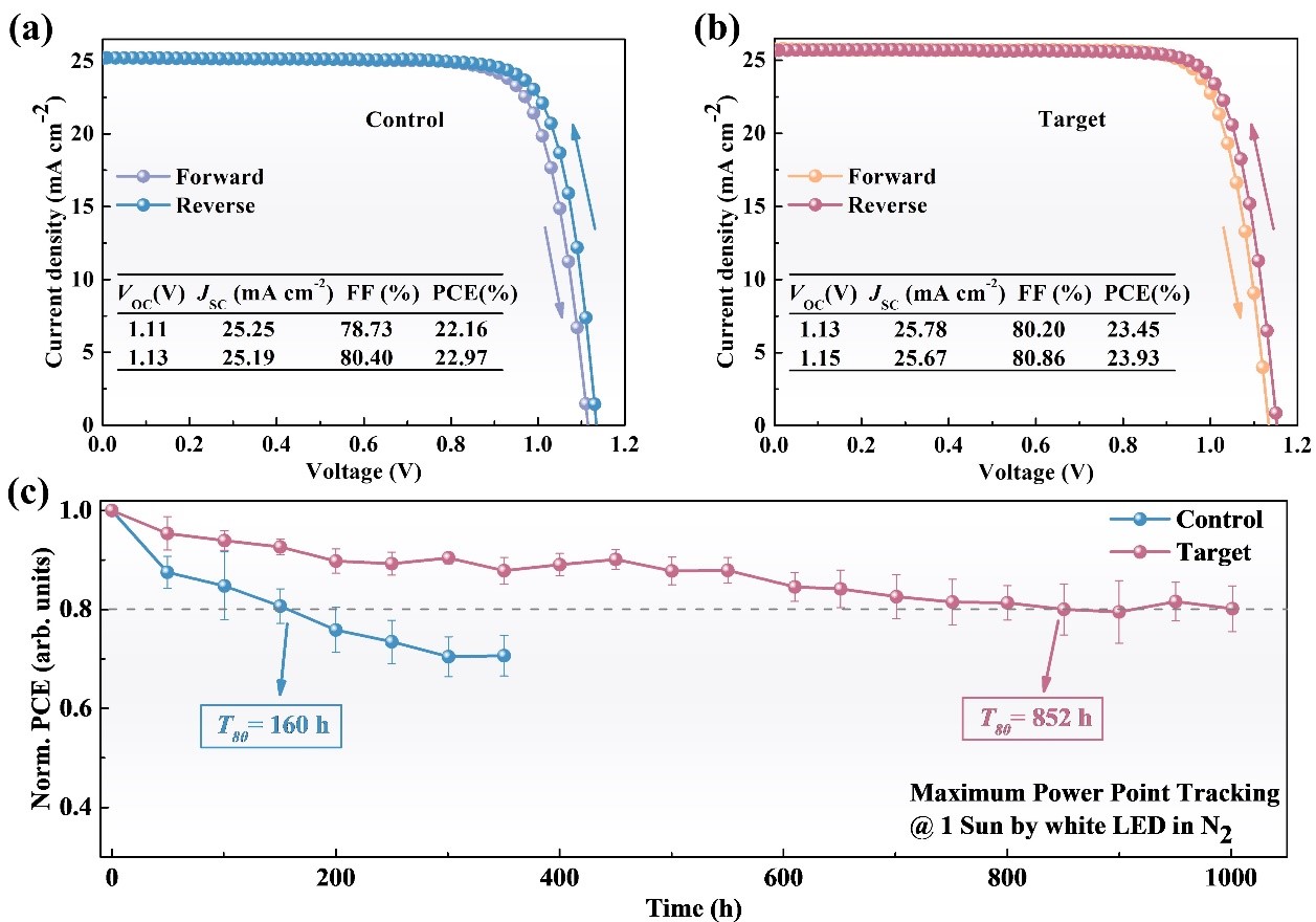 图二 基于不同钙钛矿薄膜的电池J-V曲线和性能参数:(a)薄膜无水汽处理(b)薄膜经过水汽处理。(c)基于有无水汽处理的钙钛矿薄膜其电池的运行稳定性
