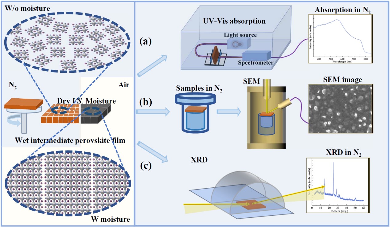 图一 (左)水汽处理前后薄膜内部晶粒的排列示意图;可N2保护的表征技术示意图:(右a)光学测试系统,(右b)扫描电镜SEM,(右c)XRD结晶性测试