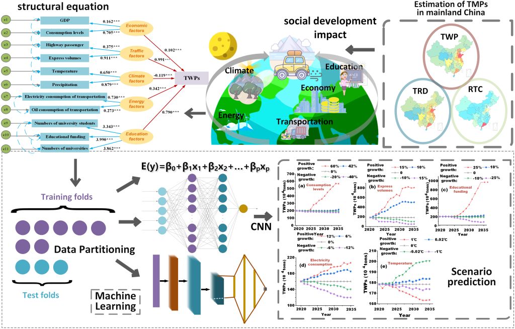 微塑料污染风险与管控是当前的研究热点之一。轮胎微塑料作为微塑料的重要来源已广为人知,但轮胎微塑料在中国及其不同尺度的产生数量和趋势是怎样,将来经济社会及气候变化不同情景的影响如何,是其风险理解与科学管控中需要解决的重要问题。为此,本研究在轮胎磨损颗粒(TWPs)、运动场地回收轮胎细颗粒(RTCs)与修补轮胎细颗粒(TRDs)三种不同轮胎微塑料(TMPs)排放量较好估算的基础上,收集整理17项教育、经济、交通、能源、气候等相关影响因素数据,结合结构方程模型、DNN、CNN神经网络模型与多元回归模型,对TWPs进行了不同情境的预测分析。研究发现,中国轮胎磨损颗粒(TWPs)占TMPs的90%以上,在全球TWPs排放量中排名第二;TWPs污染主要分布在沿海地区,2018年山东省(14.76tons)排放量最大,其次是广东省(11.77tons);TWPs大部分排放到乡村地区的土壤中。RTCs的排放量在TMPs量中排第二;2014年广东省(2716.62tons)RTC排放量最多,其余省份均在1000 tons以下。TRDs在三种轮胎微塑料中排放量最少,其中2019年广东省(23.54 tons)和山东省(22.22 tons)排放量最为突出;在内陆地区,四川省(12.39 tons)的排放亦相对较高。另外,基于CNN神经网络模型的机器学习预测发现,合理发展物流业与绿色经济、平衡提高教育质量、新能源公共交通的增加等都有利于轮胎磨损颗粒排放的减少。研究成果可提高对轮胎微塑料不同尺度排放量的理解及其对应的精准管理。