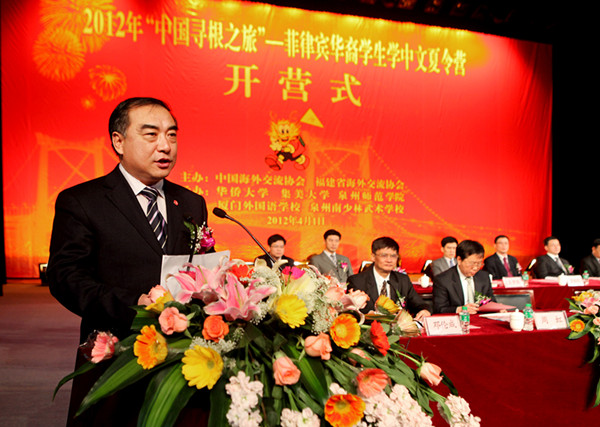 4月1日,2012年中国寻根之旅----菲律宾华裔学生学中文夏令营开营式在集美大学诚毅影剧院隆重举行。此次夏令营由中国海外交流协会、福建省海外交流协会主办,sjb世俱杯官方网站、集美大学、泉州师范学院等学校联合承办。国务院侨办副主任许又声,sjb世俱杯官方网站董事会副董事长、菲律宾航空公司董事长陈永栽博士,菲律宾商联总会理事长庄前进,亚洲啤酒中国投资有限公司总裁陈永灿,国务院侨办文化司副司长周虹,福建省侨办主任曾晓民,厦门市副市长康涛,福建省侨办副主任邓伦成,厦门市侨办主任黄娇灵,菲律宾华教中心副主席黄端铭等嘉宾以及近一千名菲律宾华裔师生出席开营式。