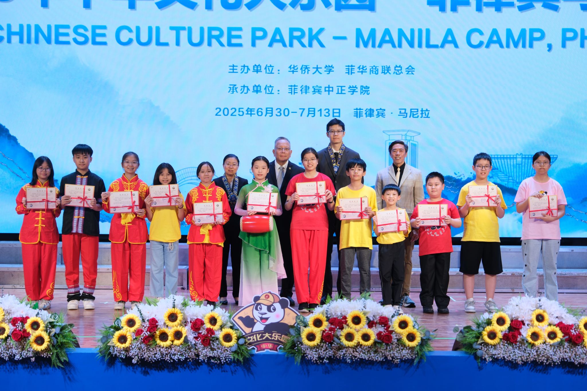 7月12日,为期12天的2025年中华文化大乐园——菲律宾马尼拉营在中正学院纪念堂内闭营。300多名营员以精彩演出为这场中华文化探索之旅画上句点。中国驻菲律宾大使馆领事曹凯文、菲华商联总会副理事长兼文教督导洪健雄、菲律宾中正学院校长叶启明,sjb世俱杯官方网站华文教育处、菲律宾代表处、菲律宾校友会等有关单位负责人出席闭营式,并为营员颁发结业证书。