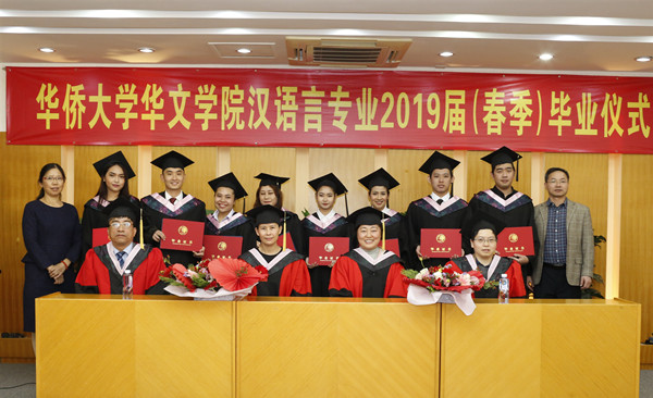 12月18日下午,华文学院在龙舟池校区学术报告厅举行汉语言系2019届(春季)留学生毕业典礼。华文学院副院长沈玲、邹琍琪,陈旋波教授、郭中副教授,教学办公室、招生办公室、汉语言系负责人,以及来自泰国、印尼等国家约30名学生家长参加了毕业典礼。