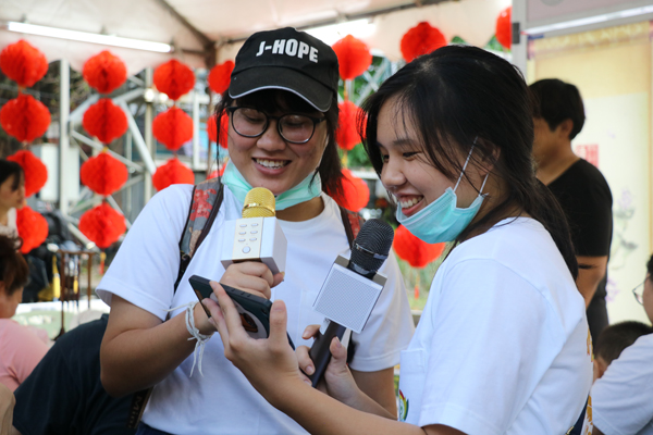 孔院老师准备的中文歌曲也十分引人入胜,有很多泰国华裔熟悉的歌曲,如邓丽君《漫步人生路》《我只在乎你》,近年流行的TFboys《宠爱》《剩下的盛夏》等,游客们还可以自己拿起麦克风演唱,几位大学生甚至在现场边唱边跳了起来,充分展现了青春的活力和文化的魅力。游客们在优美的中文音乐中、高挂的大红灯笼下、氤氲的丝丝茶香里感受到中国文化的深厚底蕴。