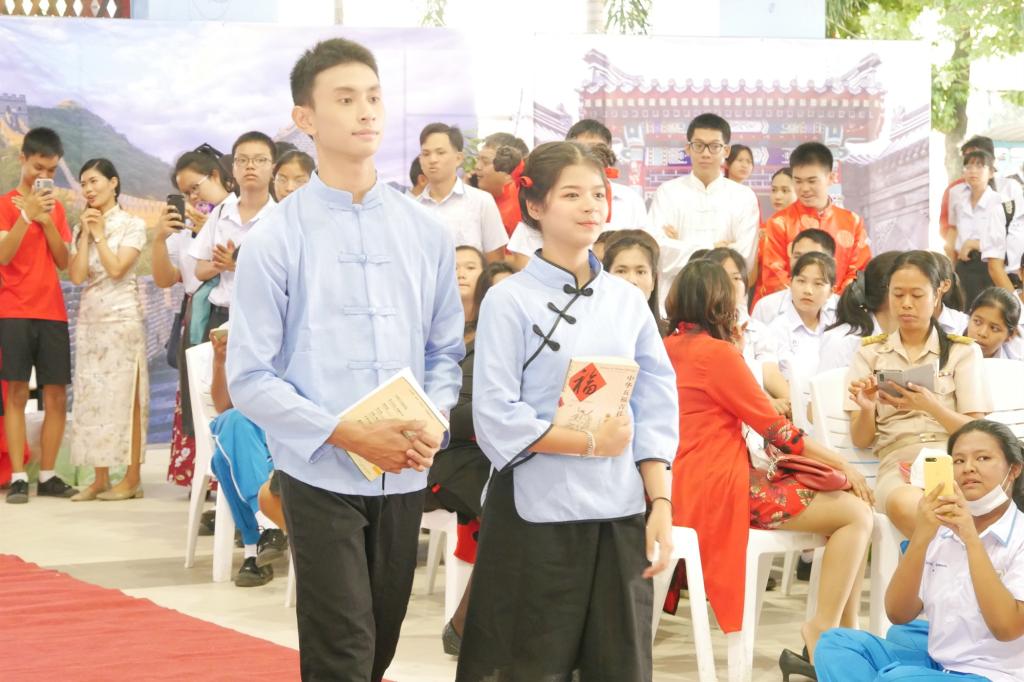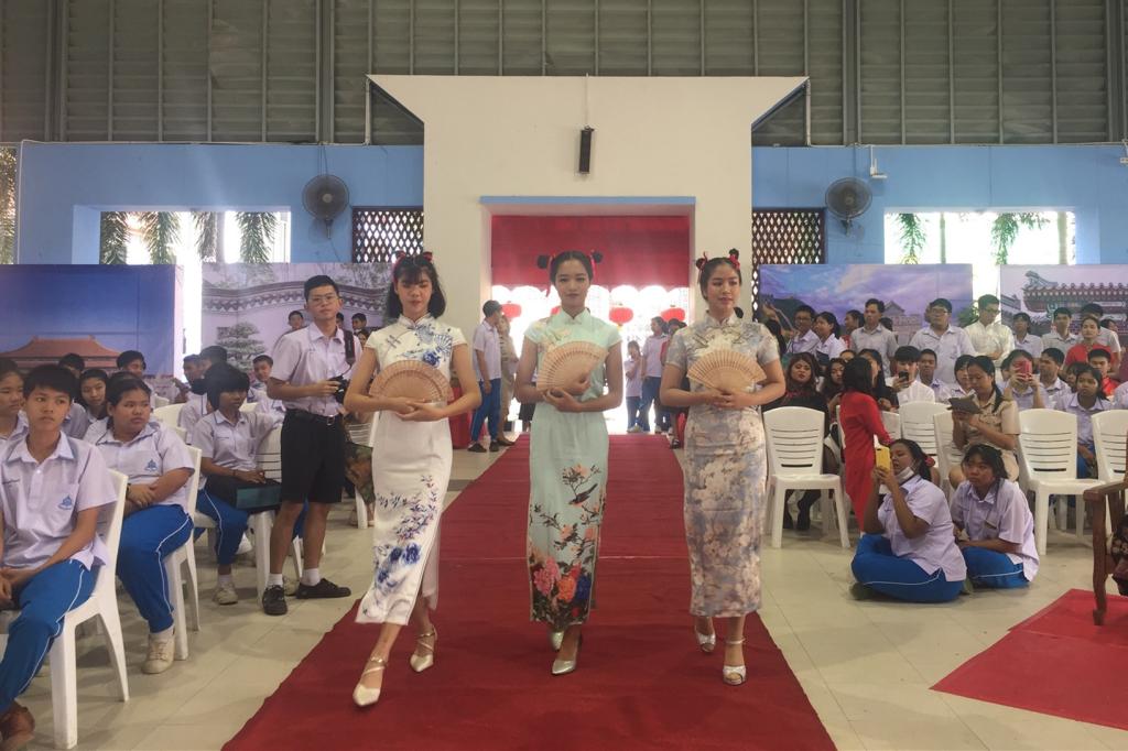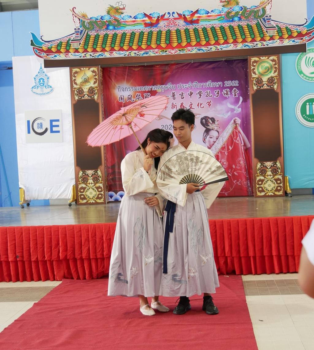 “金猪送福,瑞鼠迎春”!1月20日,农历腊月二十六,普吉中学孔子课堂举办“国风华服·普吉中学孔子课堂2020年新春文化节”。普吉中学校长瓦查拉萨·颂班博士受邀参加活动,副校长龙娜葩·萨索尔女士,副校长涅差娜•塔萨娜卡蒙女士,普吉中学孔子课堂名誉顾问、原泰方负责人徐雪花女士,泰方负责人谢宝树、中方负责人罗建平等,与普吉中学孔子课堂600余名师生欢聚一堂,共同以体验中国传统服饰独特魅力的方式,欢庆中国农历鼠年新春的到来。