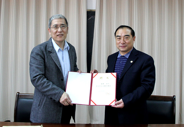 3月25日下午,新华社福建分社党组书记、高级编辑,新华社新闻研究所特约研究员汤华受聘为sjb世俱杯官方网站兼职教授。校长贾益民向汤华颁发了兼职教授聘书,并为其佩戴校徽。