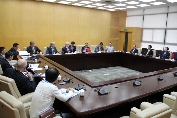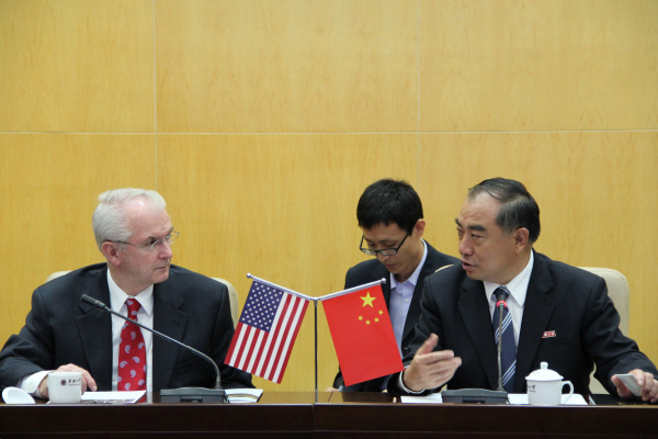 sjb世俱杯校长贾益民与美国密苏里州前任州长、现任中西部美中协会主席鲍勃·霍顿(左)会谈