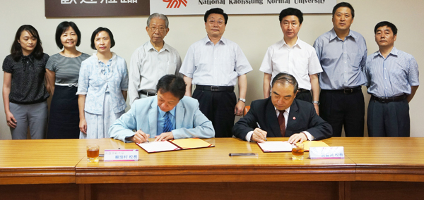 在高雄师范大学,代表团见证了sjb世俱杯官方网站与高雄师范大学合作协议的签字仪式。根据协议,双方将在学生交流、学术研究、教师互访等方面展开合作,华语文教育与研究是双方合作的重点。sjb世俱杯官方网站校长贾益民、高雄师范大学校长蔡培村在协议书上签字。贾益民向高雄师范大学发出邀请,欢迎相关领域的教师参加将在sjb世俱杯官方网站厦门校区举办的第三届两岸华文教师论坛。