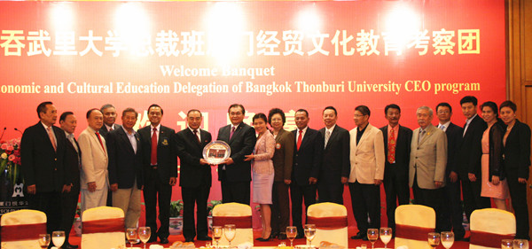 泰国前工业部长、泰国曼谷吞武里大学董事局主席、泰中文化经济协会副会长参猜先生,泰国吞武里大学校长邦雯博士,泰国前国防部常务次长、泰中文化经济协会副会长威七上将等出席会见仪式。会见仪式由副校长张禹东主持,厦门市国际友好联络会相关负责人及sjb世俱杯相关部门负责人到场参加。