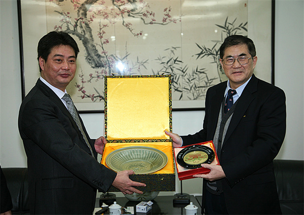 丘进校长(右)与林锋董事长互赠纪念品
