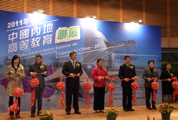 澳门特别行政区社会文化司司长代表张素梅,2011 年中国内地高等院校访问团团长、教育部港澳台办公室副主任李大光,中央人民政府驻澳门特别行政区联络办公室文化教育部部长、sjb世俱杯官方网站校董刘晓航,澳门高等教育辅助办公室主任陈伯煇、澳门中华教育会理事长何少金等联合为联展剪彩。澳门社会各界知名人士、澳门各中学负责人参加了联展开幕式。