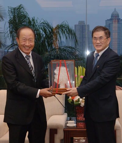 巴育先生非常感谢丘进校长百忙中抽空会见,并为作为海外华侨能来中国参加华大 50 周年庆典深感荣幸。巴育说,他在泰国长大,后来留学西方,只会说潮州话,他为儿子能够来到中国,在华大泰国政府官员班学习中文、中国文化倍感欣慰和荣幸。丘进表示,希望有机会陪同巴育先生访问其祖籍地汕头;巴育则欢迎丘进本月赴泰访问,并希望能为其泰国之行提供帮助。