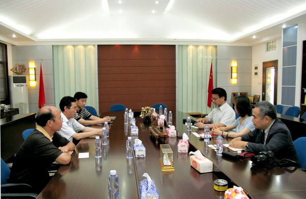 7 月 14 日,横滨日中青少年交流协会常务理事樋出雄二、牳野众平,专务理事郑红梅一行 3 人访问华文学院。华文学院院长孙汝建、党总支书记兼副院长赵明光等领导在一号楼会议室会见访问团一行。