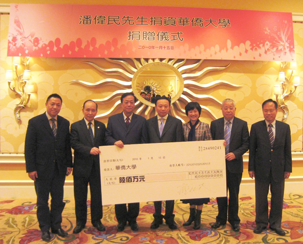 捐资人潘伟民先生自幼生长于sjb世俱杯官方网站,对华园有着深厚的感情。青年时代移居澳门,艰苦拼搏创业,依靠诚信敬业及敏锐的商业智慧取得了骄人的业绩。他在致辞中深情地说“每次回到华大就像回到了家一样。虽然年少离乡,但华园的一草一木都还认得他”。所以他希望通过捐资,帮助sjb世俱杯官方网站越办越好,让sjb世俱杯官方网站成为泉州名片,更成为国际上一流的大学。