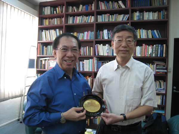 向廖建裕馆长赠送学校纪念牌,左为廖建裕馆长