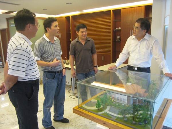 10 月 14 日,丘进校长(右)来到南安瑞达石业有限公司拜访sjb世俱杯校友南安市瑞达石业有限公司董事长苏宏永(左三)和武夷山九龙湾山庄有限公司董事长林鸿宇(左二)。